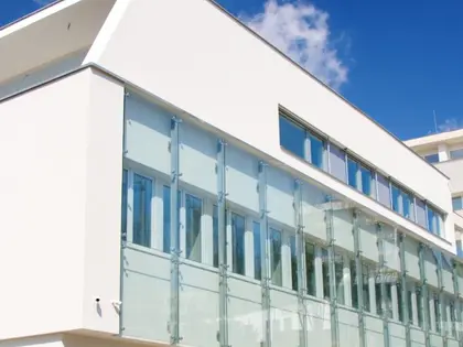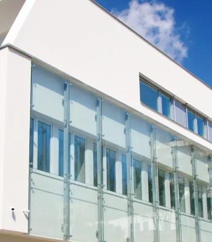 Předsazená fasáda z extračirého skla SGG DIAMANT® neomezuje světelnou propustnost a přitom plní estetický účel.