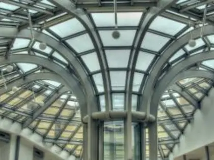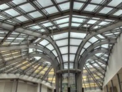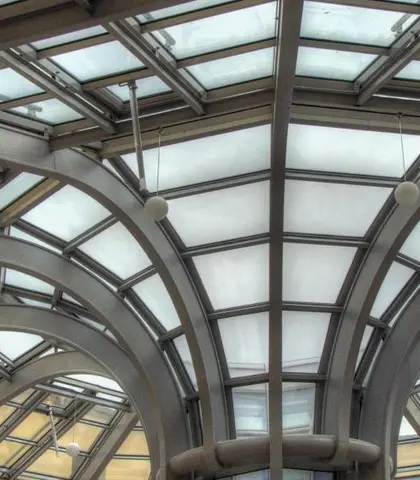 Střešní zasklení vnitřního atria Salmova paláce v Olomouci. Toto zasklení současně slouží jako odvod vody, která protéká středovým tubusem.