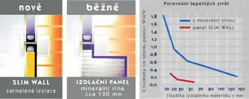 V porovnání s běžně používanými fasádními panely, které mají jako izolační jádro minerální vlnu a jejichž tloušťka se obvykle pohybuje okolo 130 mm, má izolační panel SLIM WALL® menší tloušťku stavebního prvku. Tím je dosaženo i jednoduššího konstrukčního řešení detailu. Jádro panelu SLIM WALL® vloženého do dutiny izolačního skla tvoří vysoce izolační materiál.