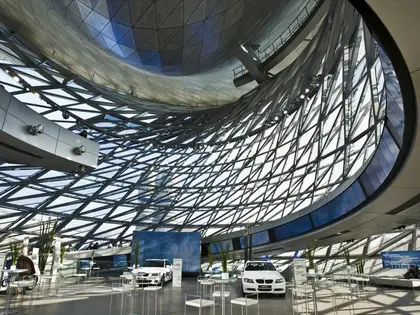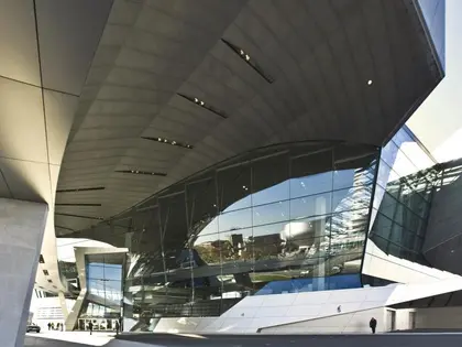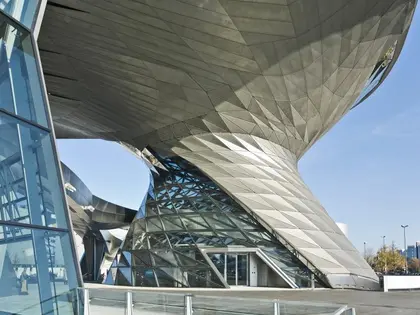 Velmi odvážný návrh vídeňských architektů ze studia COOP HIMMELB(L)AU začleňuje budovu BMW Welt v Mnichově velmi vizionářským a trendovým způsobem do světově proslulého okolního prostředí. Charakter i struktura jsou silně vymezeny stávající hravostí mezi plovoucí střešní konstrukcí nad flexibilními a transparentními výklady. Na první pohled je imponujícím a dominantním prvkem dvojitá kuželová fasáda. Sklem a ocelí pokrytá konstrukce ve tvaru tornáda se stáčí směrem vzhůru a je zakončena střechou připomínající mrak. Tu tvoří dynamická deformace dvou nosných vazníků a představuje tak hlavní nosný prvek celé konstrukce střechy.