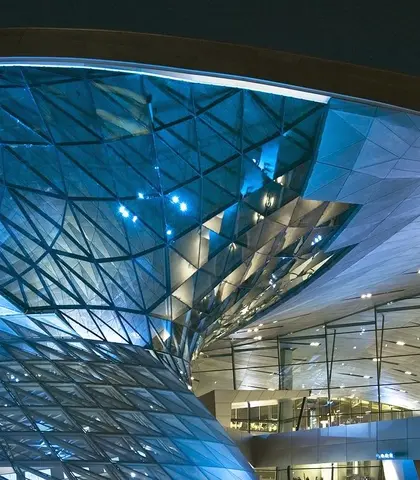 Velmi neobvyklý tvar budovy kladl nároky na geometrii a přesnost fasádních prvků. Proto vytvořila Glassolutions na 900 různých 3D prvků z izolovaného bezpečnostního skla o celkové ploše asi 2850 m2. Aby se předešlo typické zelené patině na povrchu skla, byl použit jako výchozí materiál sklo s nízkým obsahem železa DIAMANT. Jednou z největších výzev tohoto projektu se tak stala dodávka celkem 12400 m² skla ve 26 různých podobách a tvarech. Instalace každého jednotlivého skleněného komponentu se musela velmi přesně naplánovat. Kombinace každého z produktů Glassolutions, v tomto případě DIAMANT, STADIP, SERALIT LITEX a dalších, vytvořila skutečně unikátní a imponující vzhled budovy BMW Welt v německém Mnichově.