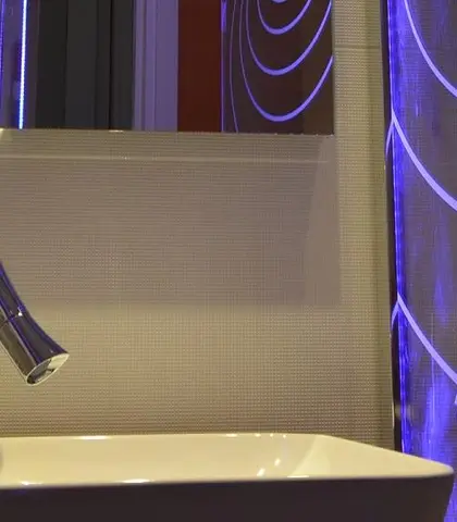 Hotel Ampere je 4-hvězdičkový hotel s kapacitou přibližně 100 pokojů. V souvislosti s renovací hotelových koupelen hledal ředitel hotelu něco mimořádného a neobvyklého, co v jiných hotelech neuvidíte. Hlavním cílem bylo oživit lázeňskou pověst hotelu a přinést jeho hostům pocit klidu, pohody a především příjemné prostředí. Glassolutions má ve své nabídce širokou škálu produktů, které velmi citlivě integrují světlo do skla. A právě světlo bylo v tomto případě klíčovým prvkem celého návrhu, neboť skvěle vytváří potřebnou atmosféru. Zrcadla DESIRE od Glassolutions spolu se sprchovými zástěnami INSPIRATION perfektně kombinují v návrzích architekta Fabrice Knolla sklo a světlo. Nejde o pouhé osvětlení - světlo se v kombinaci se sklem stává zdrojem odpočinku a soukromí. Dle požadavků zákazníka bylo zvoleno teplé bílé LED osvětlení (mezi 3000 a 4000 K).