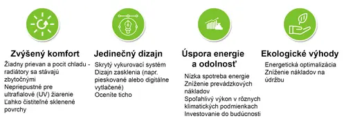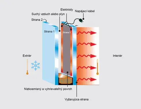 Vyhřívané sklo vzniklo spojením dvou skel, z nichž jedno obsahuje oxid kovů. Temperuje prostory a zabraňuje vzniku kondenzátu z interiérové strany.